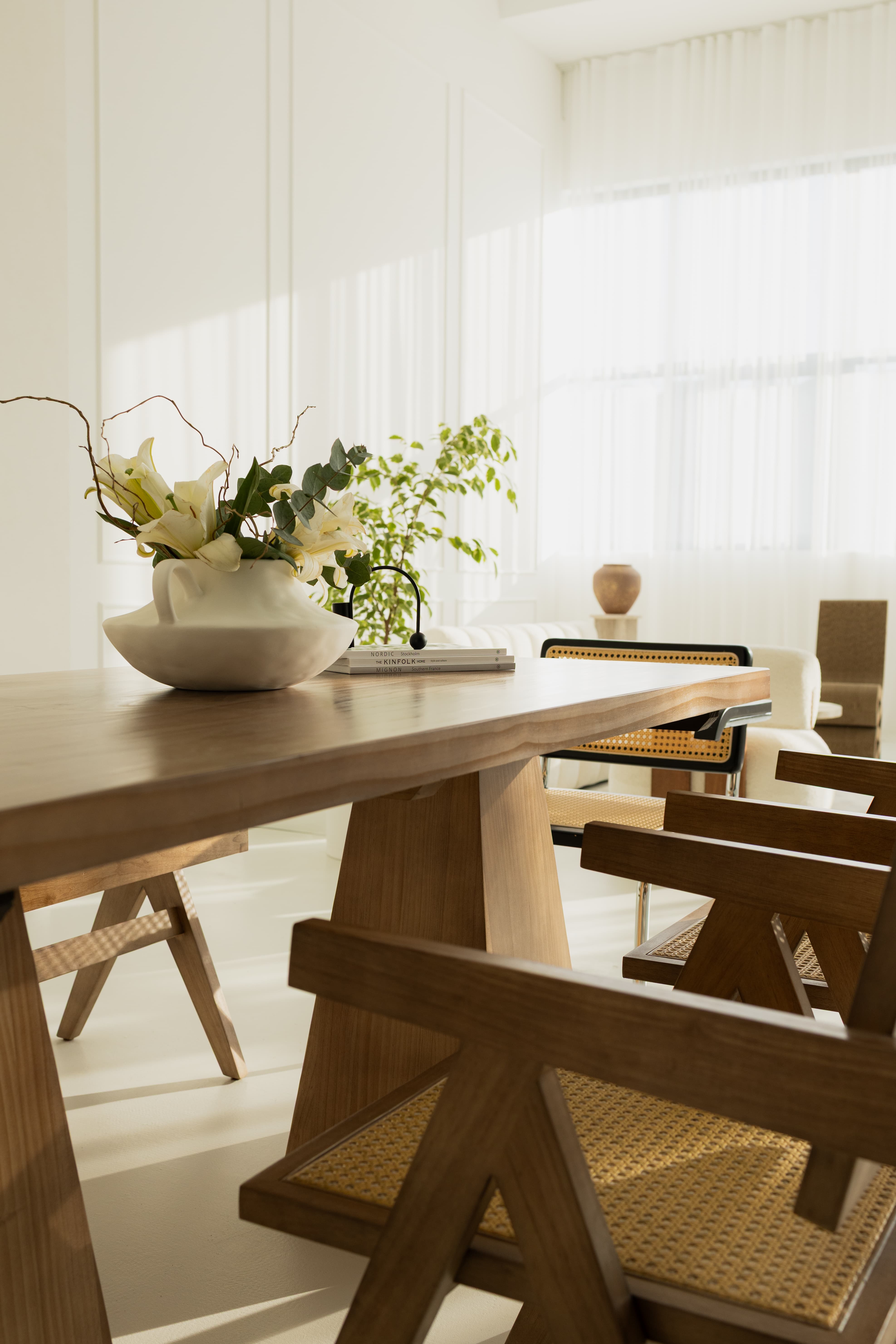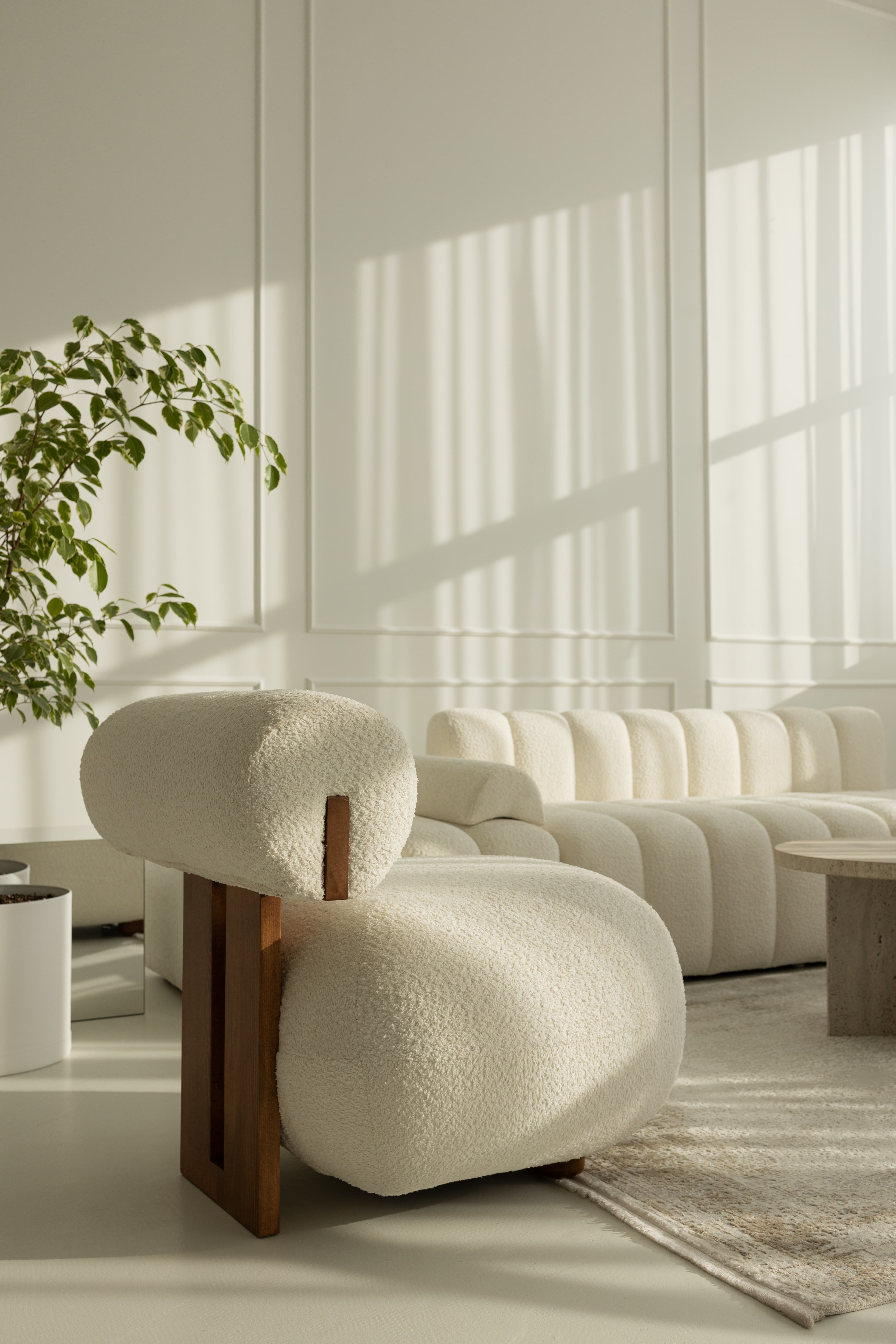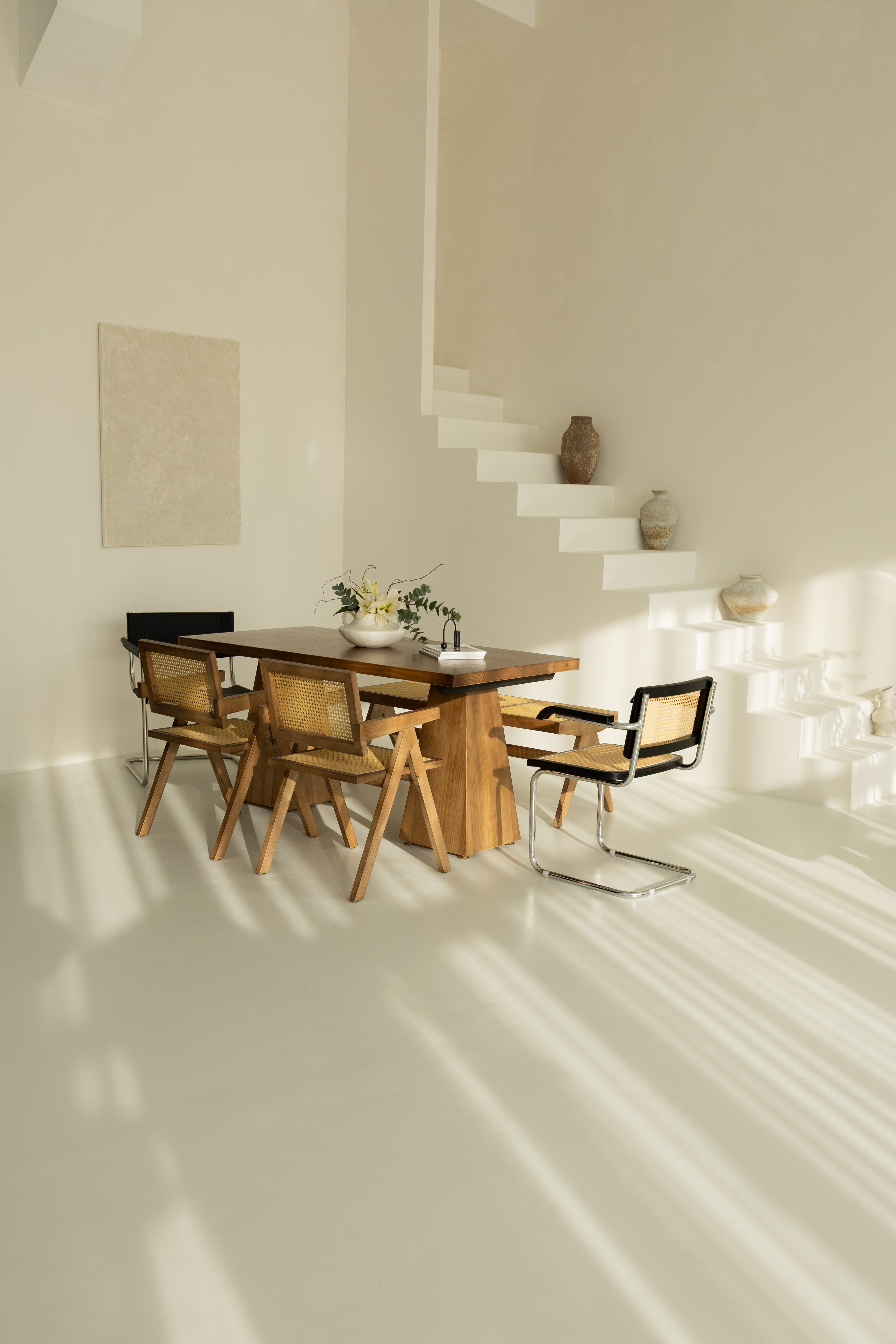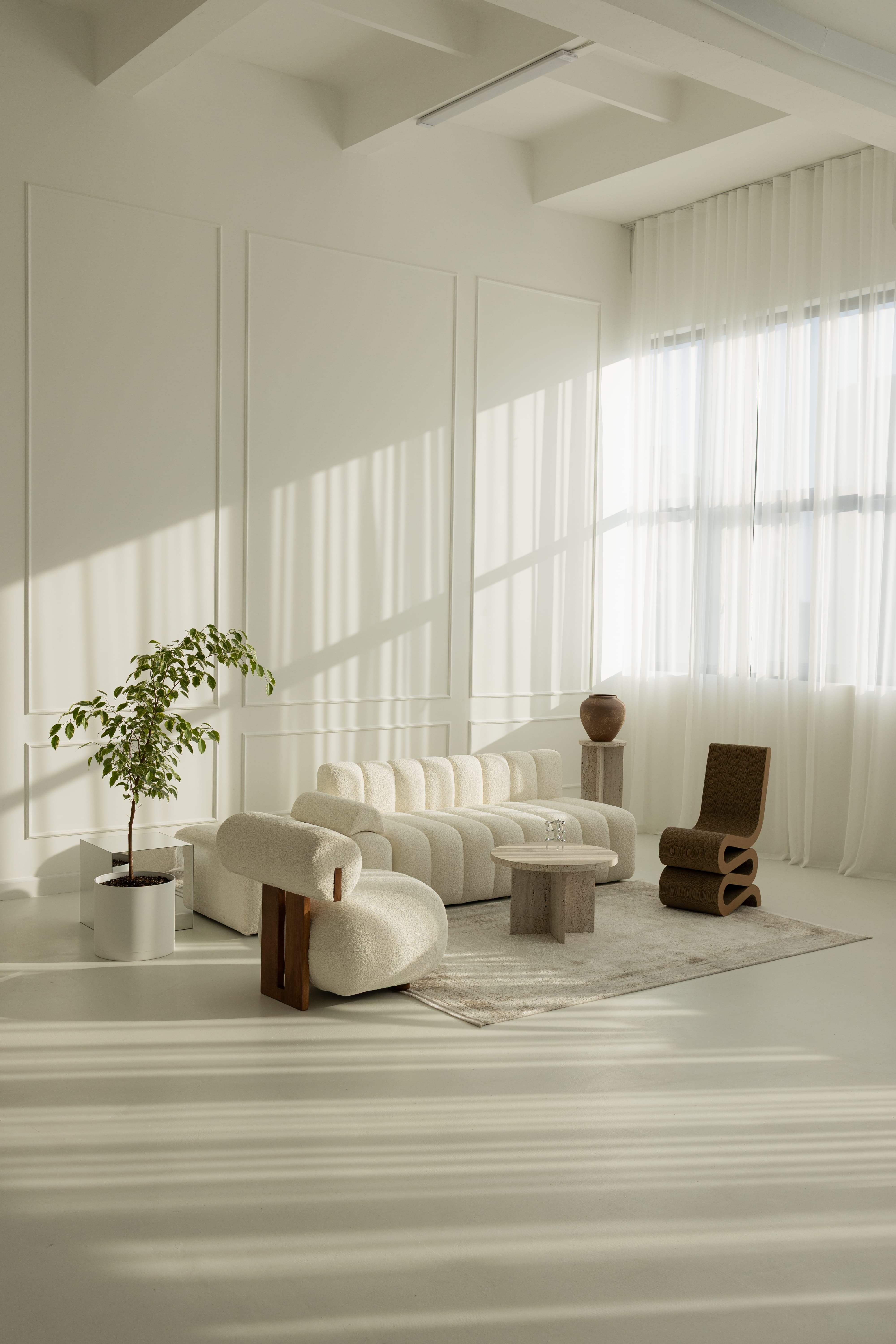 The living room is a 110-square-meter space designed in Scandinavian and modern styles, featuring large south-facing windows and a ceiling height of 4.5 meters. The studio includes a cyclorama measuring 6 × 4 × 4.5 meters and receives abundant natural light. Sunlight enters the studio during daylight hours, from 10:30 AM to 6:00 PM. The exact hours of direct sunlight may vary depending on the season. The studio is equipped with a dressing room and offers the possibility of installing a wide range of colored backdrops. The room is furnished with a vintage white sectional sofa, minimalist white armchairs, a wooden table with chairs, a bench, and various other designer chairs. This cozy studio, decorated in neutral tones, provides a perfect setting for family photoshoots, fashion projects, masterclasses, content creation, and advertising campaigns. «Լիվինգ ռումը» 110 քառակուսի մետր սկանդինավյան և ժամանակակից ոճով սենյակ է՝ մեծ, հարավ նայող պատուհաններով ու 4.5 մետր բարձրությամբ առաստաղով։ Տաղավարն ունի 6 × 4 × 4.5 մետր չափի ցիկլոռամա և մեծ քանակի բնական լույս։ Արևի ճառագայթները ներթափանցում են տաղավար ցերեկային ժամերին՝ ժամը 11։00-ից մինչև 18:00: Արևի ուղիղ ժամերը կարող են փոխվել տարվա եղանակի հետ։ Տաղավարն ունի հանդերձարան և գունային ֆոների լայն տեսականու տեղադրման հնարավորություն։ Սենյակում տեղադրված է սպիտակ բազմաբաժին բազմոց՝ պարզ գծերով, սպիտակ բազկաթոռ, փայտե սեղան ու աթոռներ, նստարան և մի շարք այլ դիզայներական աթոռներ։ Չեզոք գույներով կահավորված այս հարմարավետ տաղավարը կատարյալ միջավայր է ընտանեկան լուսանկարների, նորաձևության, մաստեր կլասների, կոնտենտի ստեղծման և գովազդային նախագծերի համար։ Вот перевод на русский язык: «Ливинг рум» - это комната площадью 110 квадратных метров в скандинавском и современном стиле с большими окнами, выходящими на юг, и потолком высотой 4,5 метра. Студия имеет циклораму размером 6 × 4 × 4,5 метра и большое количество естественного света. Солнечные лучи проникают в студию в дневное время с 10:30 до 18:00. Часы прямого солнечного света могут меняться в зависимости от времени года. В студии есть гардеробная и возможность установки широкого ассортимента цветных фонов. В комнате установлен винтажный белый секционный диван с простыми линиями, белое кресло, деревянный стол и стулья, скамейка и ряд других дизайнерских стульев. Эта уютная студия, обставленная в нейтральных тонах, является идеальной средой для семейных фотосессий, модных съемок, мастер-классов, создания контента и рекламных проектов.